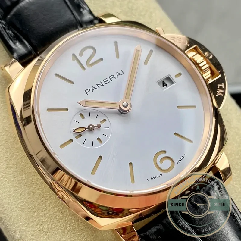 Smooth fixed bezel in matching Goldtech maintains the Due collection’s elegant aesthetic while preserving the distinctive Luminor case silhouette.