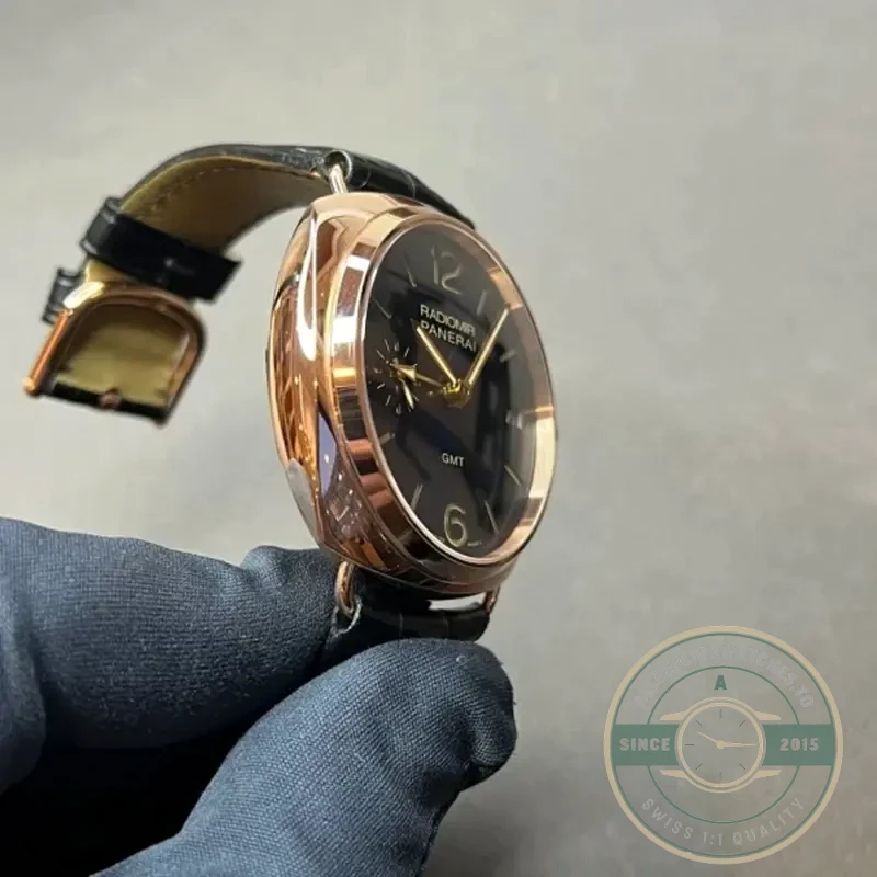 The Bezel Fixed Goldtech The smooth fixed bezel maintains the Radiomir’s minimalist philosophy. Goldtech construction matches the case material for visual continuity across the watch head. |