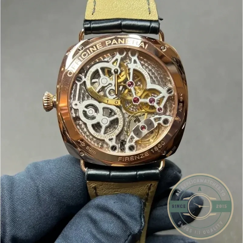 The Case Goldtech The 47mm Goldtech case features Panerai’s proprietary red gold alloy with enhanced copper content. Brushed surfaces contrast against polished edges, while the signature wire loop strap attachments maintain historical authenticity. |