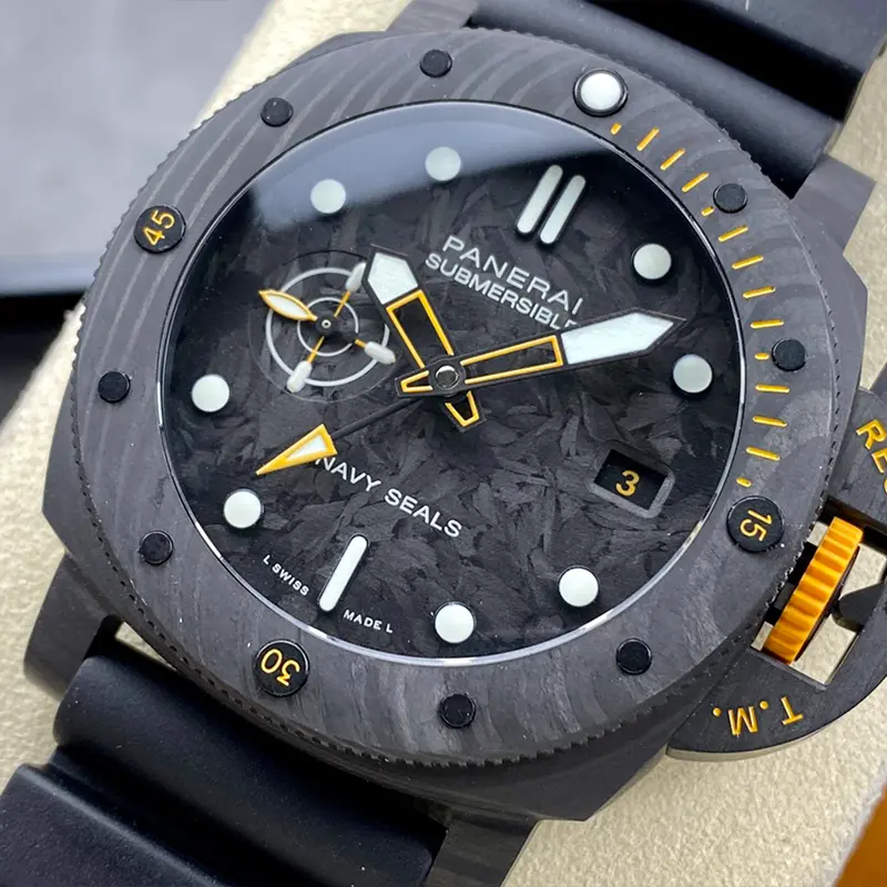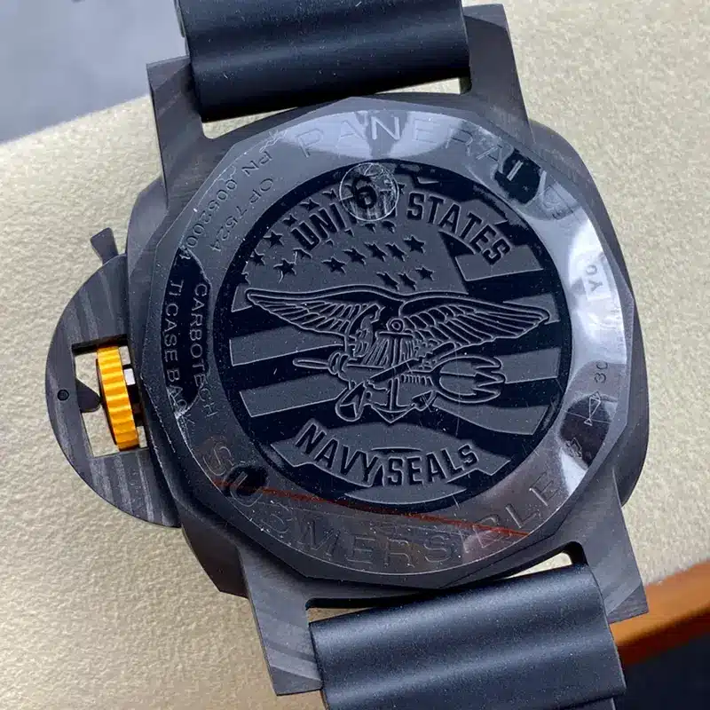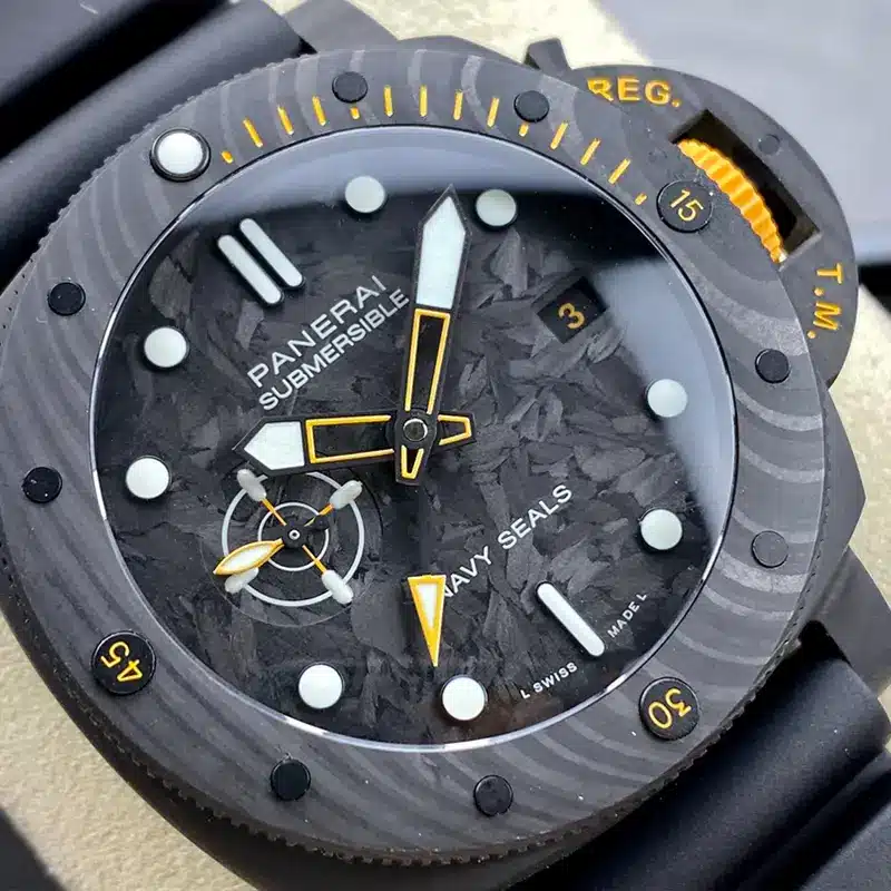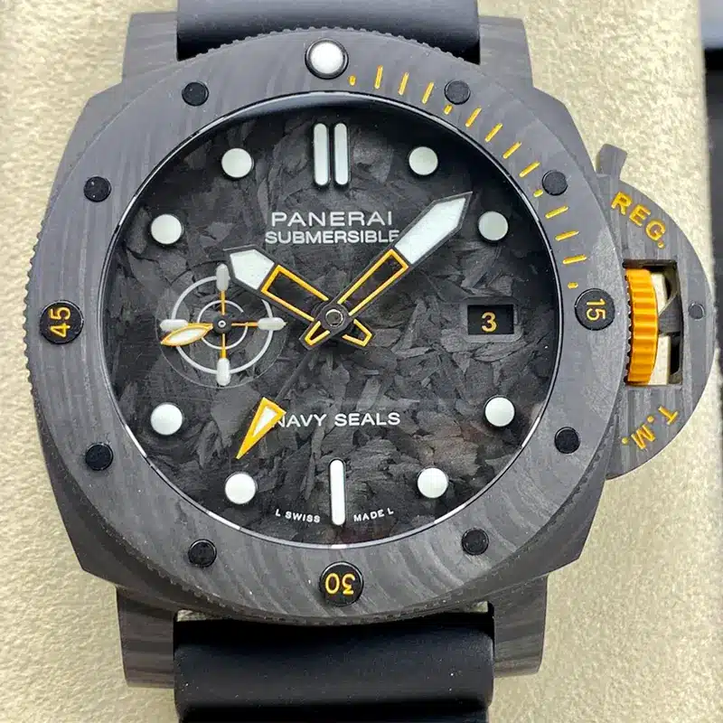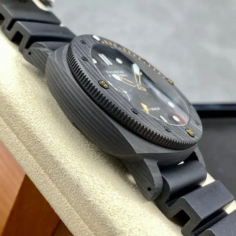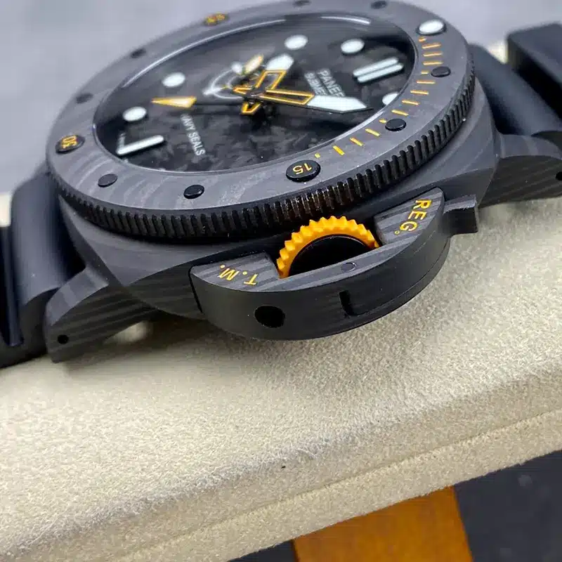 The Panerai Replica Pam1324 is an amazing watch that brings a new twist to luxury watches. What makes it stand out is its cool carbon fiber cover, giving it a modern and stylish look. Carbon fiber isn’t just for looks, though; it makes the watch really strong and light. Every piece of this material is different, so each watch is special and unique.