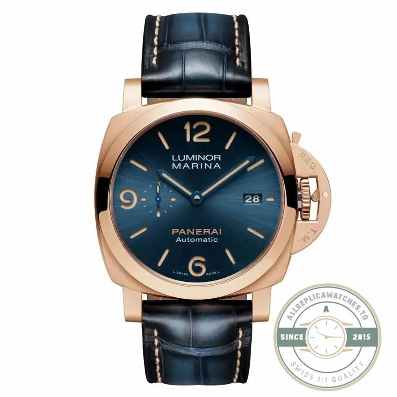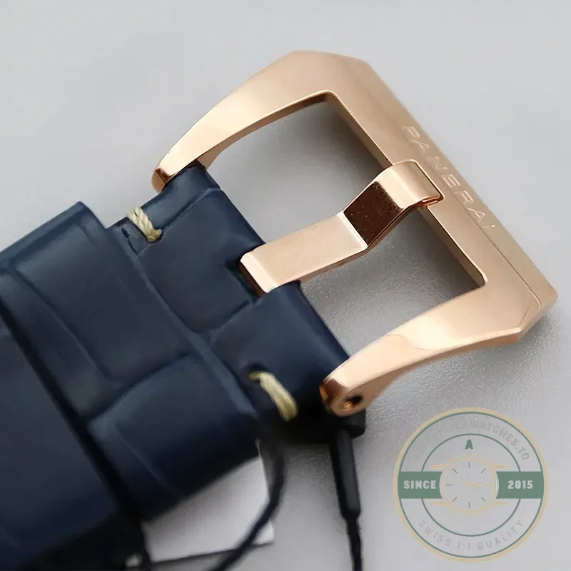 A: The exclusive Goldtech case material and blue sandwich dial combination creates a luxury sports watch that balances Panerai’s military heritage with precious metal craftsmanship.
