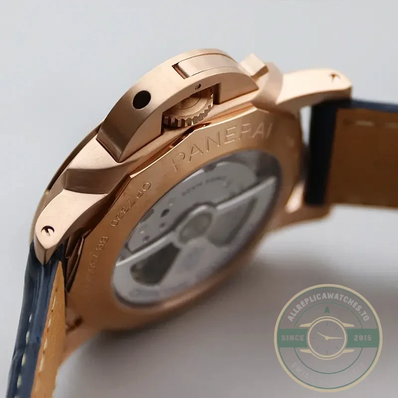 The caliber P.9000 clone features bi-directional winding rotors and off-center micro-rotor positioning. This movement includes Panerai’s signature small seconds display and maintains the brand’s three-day power reserve tradition.