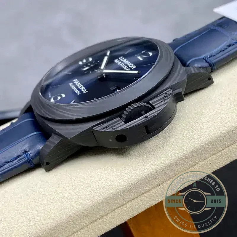The Carbotech construction and rich blue sandwich dial create a modern interpretation of Panerai’s military diving heritage, combining lightweight durability with exceptional legibility.