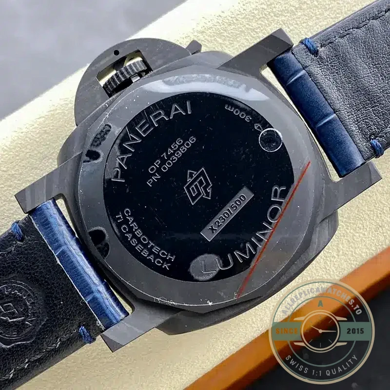 The Case Carbotech Composite The 44mm Carbotech case showcases Panerai’s innovative material technology, featuring layered carbon fiber with distinctive irregular patterns. Each case exhibits unique grain formations while maintaining exceptional strength-to-weight ratio. |