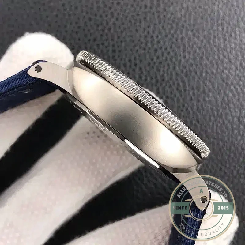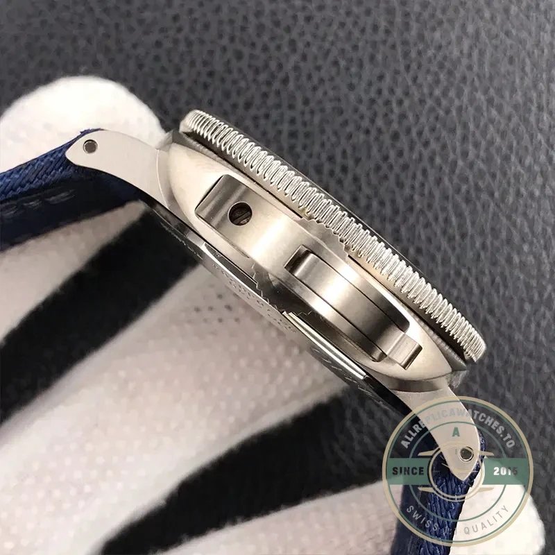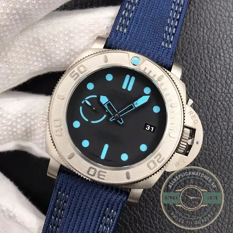 The P.9000 caliber clone delivers reliable automatic winding with small seconds at 9 o’clock and instant date change. This movement features Panerai’s signature architecture with bridges arranged to maximize dial space while maintaining robust construction for diving applications.