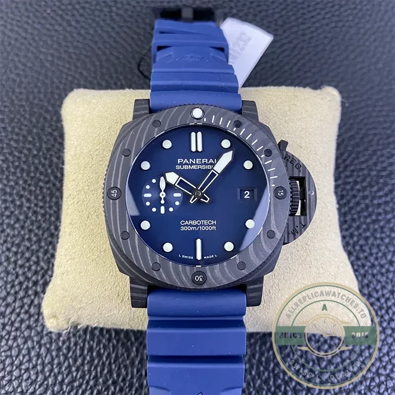 The PAM1232 represents Panerai’s mastery of carbon fiber technology, featuring an innovative Carbotech case construction that delivers exceptional strength while maintaining the collection’s signature diving watch proportions.
